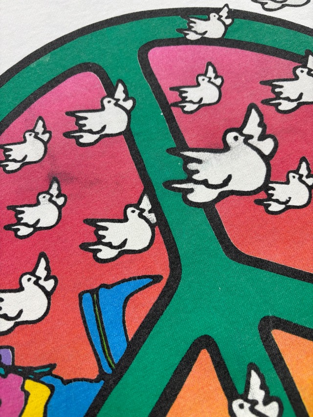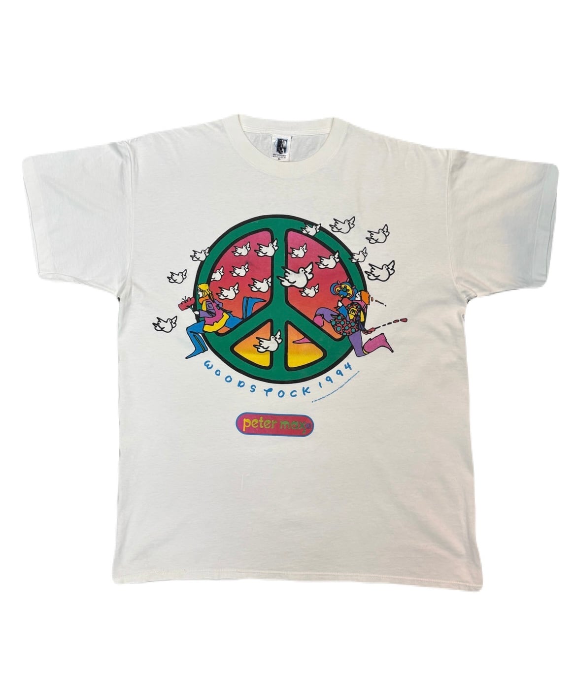 WOODSTOCK1994のPeter Maxによるアートが施されたTシャツです。音楽とアートの融合を感じるこのアイテムは、コレクターや音楽ファンにとって特別な一着となること間違いなし。独特のカラーリングとデザインが目を引く、まさにアートピースです。