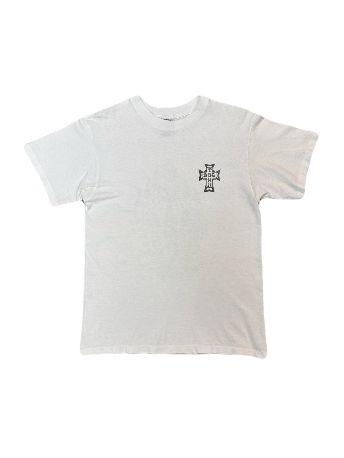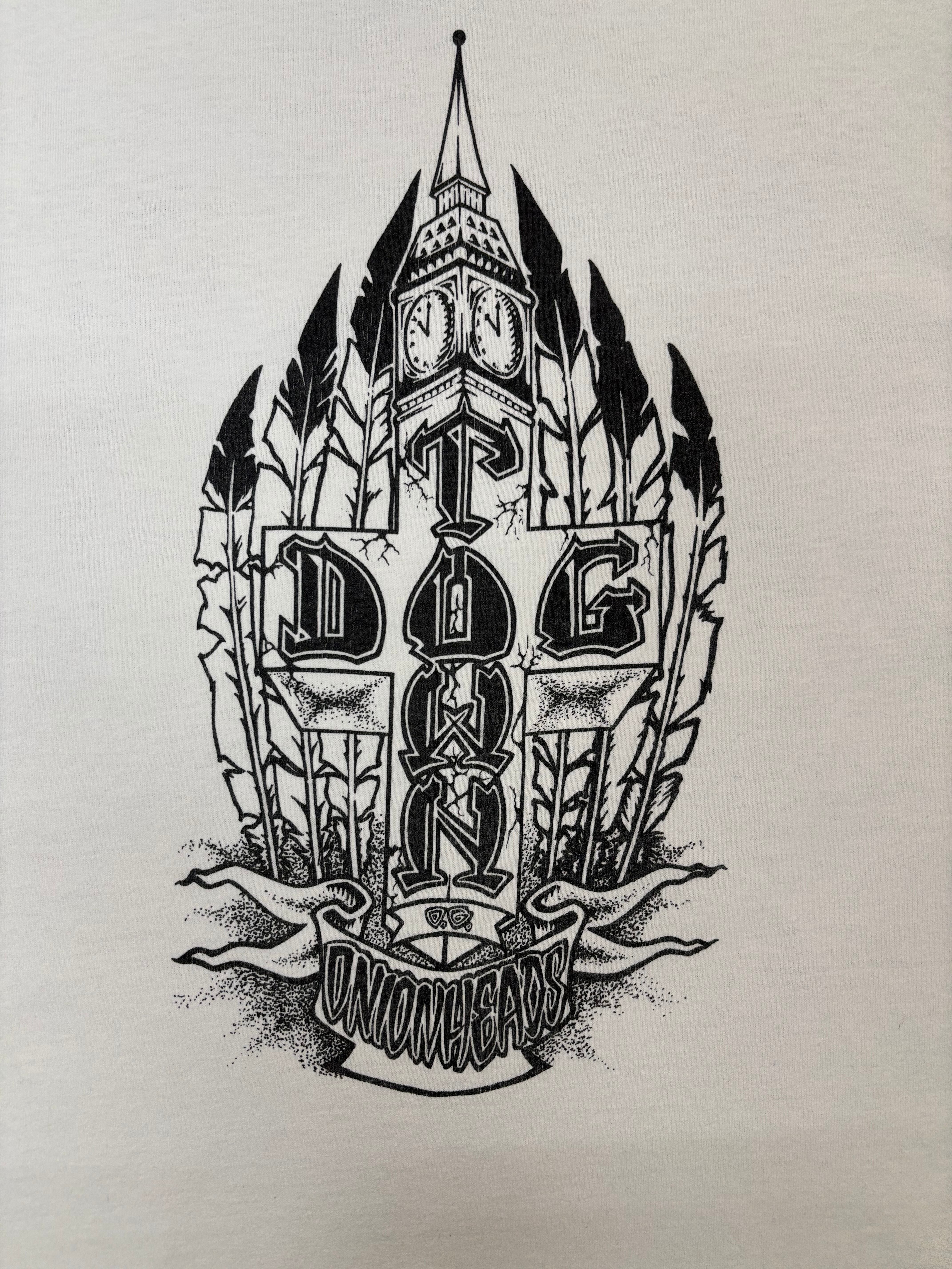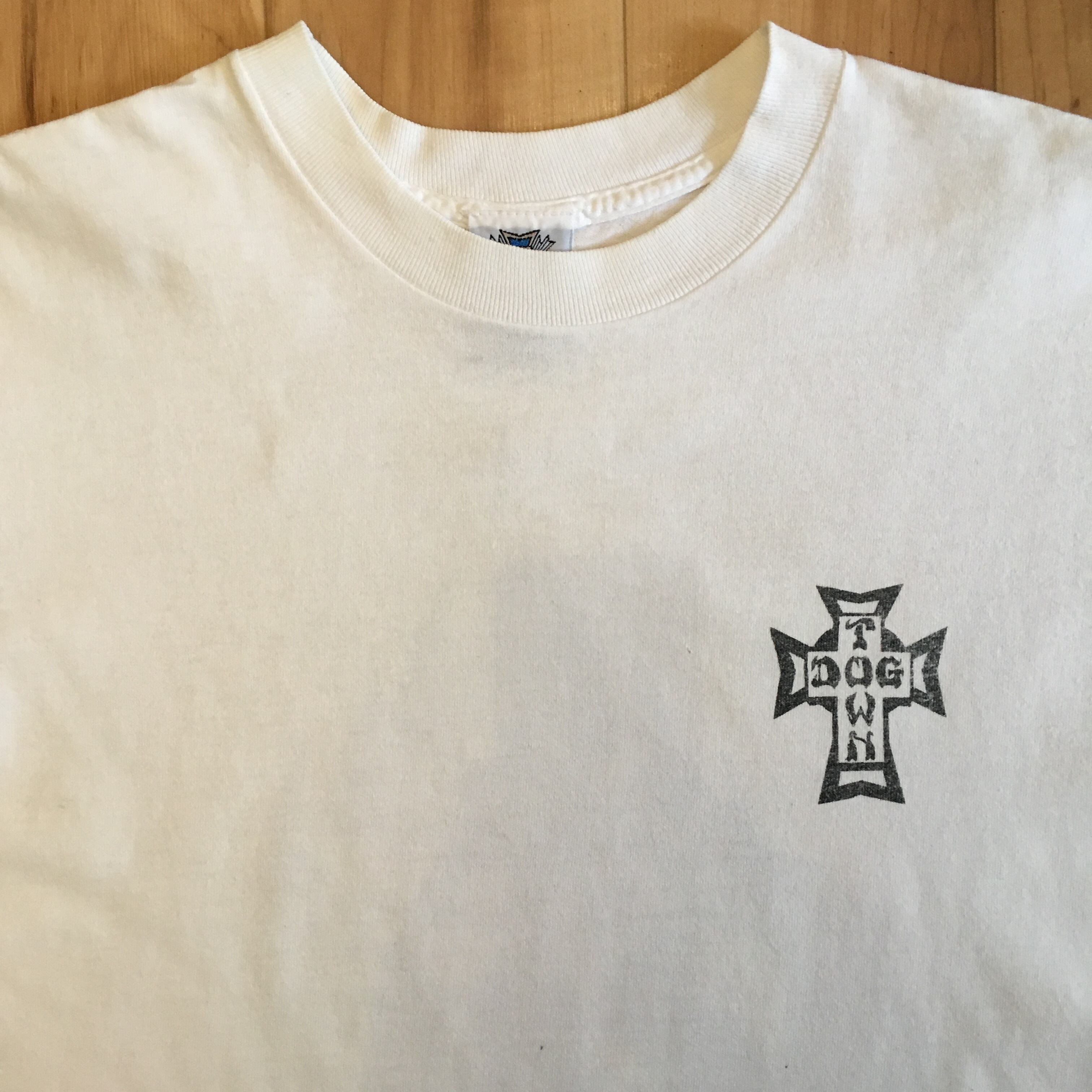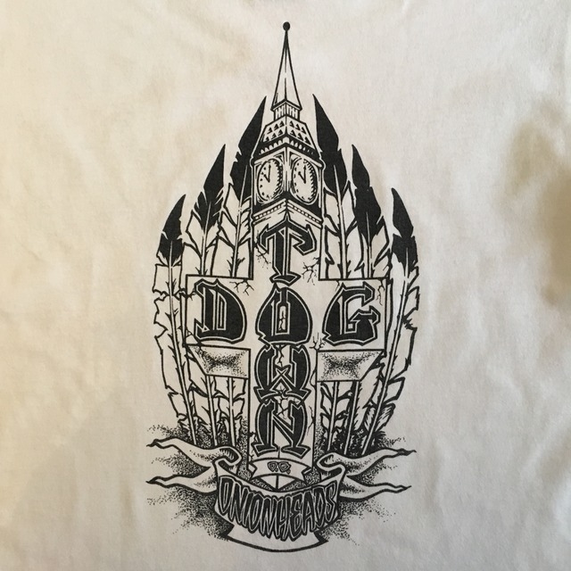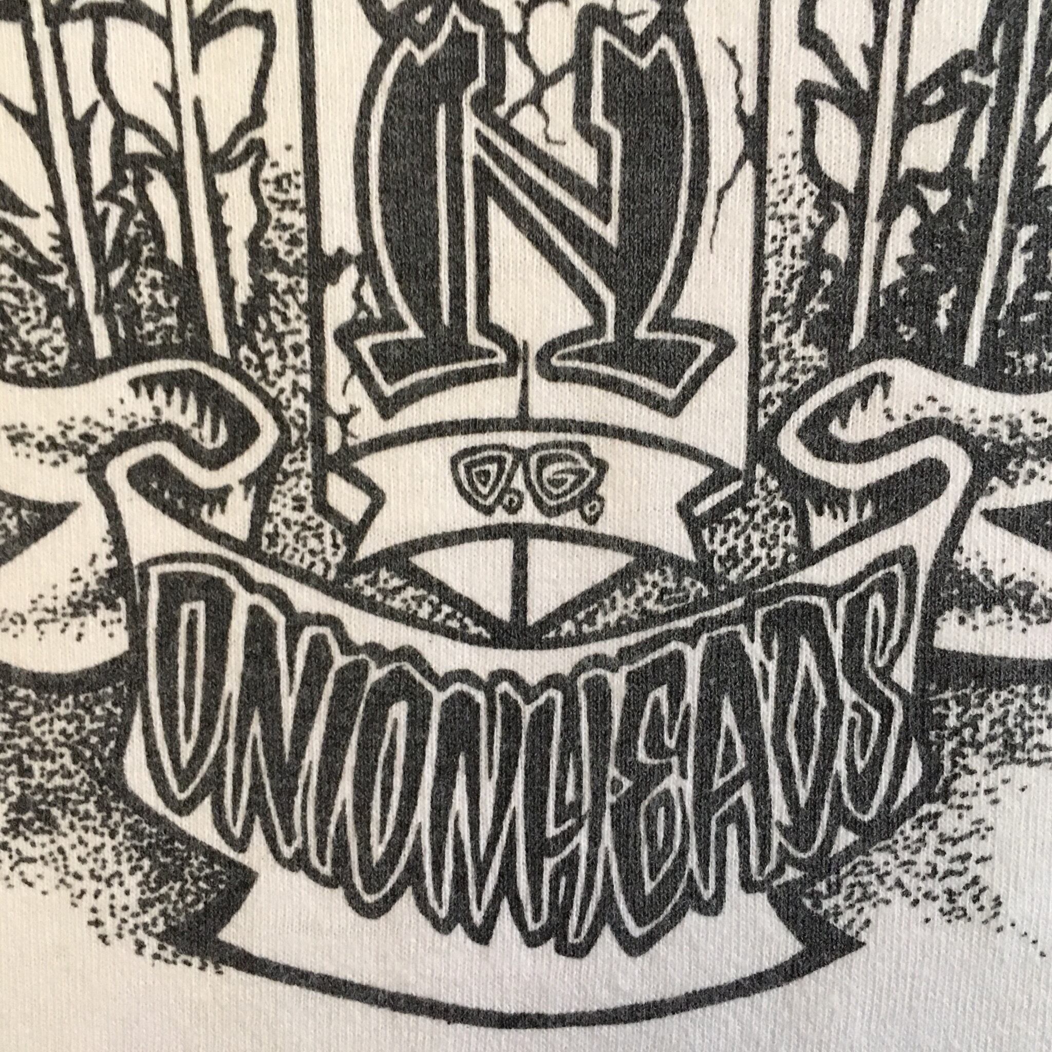 90'sドッグタウンの通称「時計台」でお馴染みのベンシュローダーのシグネイチャーになります。通常の“SHROEDER”プリントでは無く“ONIONHEADS”になりフロントも枠有りのクロスになっております。アメリカ製。